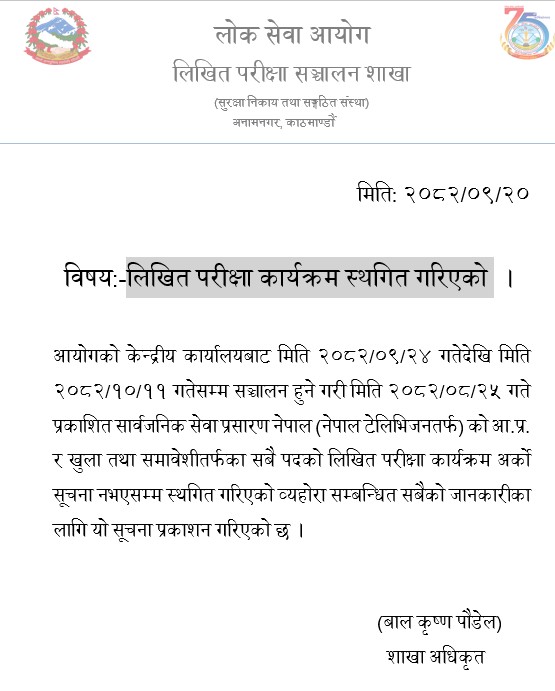 लिखित परीक्षा कार्यक्रम स्थगित गरिएको सूचना