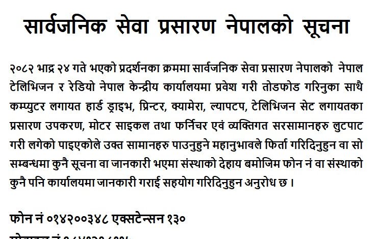 सार्वजनिक सेवा प्रसारण नेपालको सूचना Submitted: 20 September, 2025 |Notice notice-ntv.jpg सार्वजनिक सेवा प्रसारण नेपालको सूचना